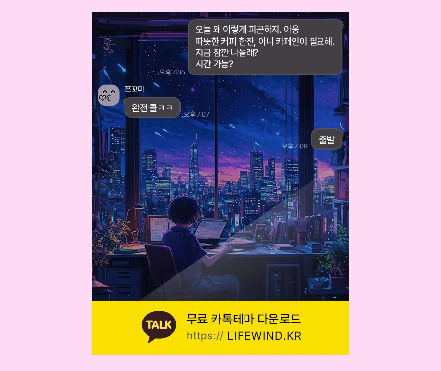 A City In The Dark Night Sky 어두운 밤하늘의 도시 카톡테마 받기 오늘 왜 이렇게 피곤하지? 아, 따뜻한 커피가 필요해. 지금 카톡 테마가 너무...